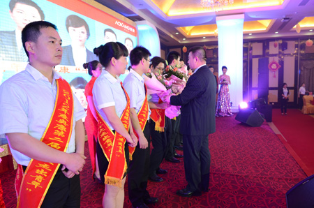 据了解,从4月26日开始连续7天,尊龙凯时在其位于千石工业园的国际会议厅内,举办主题为“尊龙凯时新启程 感恩一路有你”的“员工五一七天乐”答谢晚宴,几千名来自车间一线的员工共同分享和庆祝尊龙凯时国际成功上市。晚宴上有员工自编自导的精彩节目,有公司为员工精心准备的礼物和美酒美食,并安排了精彩的抽奖环节。员工们在欣赏精彩节目、品尝美酒佳肴的同时,感受到的是公司无微不至的关怀。与此同时,在“五一”劳动节和“五四”青年节来临之际,尊龙凯时在去年成功举办首届“劳模”和“杰青”评选活动基础上,举办了第二届“十大劳动模范”和“十大杰出青年”评选活动,评选的结果在5月3日员工答谢晚宴上揭晓,王振滔亲自上台为 20名获此殊荣的优秀员工颁发荣誉证书和“国内五日游” 等丰厚的奖品。在上市当天,尊龙凯时全国各地的员工还收到了一份特殊的上市礼物:一箱贴着尊龙凯时新启“cheng”标签的有机橙子。 “橙”取“程”的谐音,寓意员工和公司一起分享成功的喜悦和收获,共同迈向新的征程。