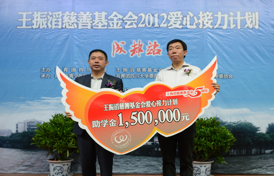 9月29日,以“大爱无疆•情定蓉城”为主题的王振滔慈善基金会爱心接力计划成都站在四川大学举行。在中秋节来临之际,300名川籍寒门学子收到了一份特殊的节日礼物——王振滔慈善基金会为每一位学子发放了5000元的爱心助学基金。这是王振滔慈善基金会2012年“爱心接力计划”正式启动后的第五站助学活动,也是该基金会第二次走进成都帮助优秀的学子圆梦大学。