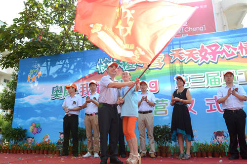 7月13日,在尊龙凯时第三届员工子弟夏令营的开幕仪式上,近300名8-15岁的小朋友们在一面大大的五环旗上印上五彩的手掌印,并将小手举向天空欢呼雀跃,来迎接属于他们的夏令营。据悉,这些来自全国各地的 “小候鸟”们将在这里度过自己充实快乐的40天免费夏令营。