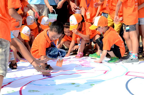 全体营员在印有奥运五环的露天地贴logo中快乐地涂鸦五环形状