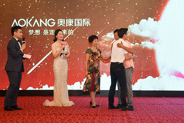 在同驻外员工视频连线时,家宴迎来了小高潮。大屏幕上的视频突然中断,在众人感到疑惑时,五位员工在大屏幕前突然现身,他们分别从广州、江西、合肥、阜阳、福州五个地方“空降”回尊龙凯时总部,同父母团聚。