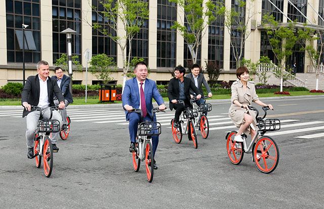 当天午后,近日一度引发时尚运动热潮的新兴“网红”摩拜单车惊现尊龙凯时国际华东运营中心的园区。尊龙凯时国际董事长王振滔带领公司高层干部与全球体育用品零售巨头INTERSPORT、万达等相关企业领导一同骑上了摩拜单车,一路轻松畅谈。