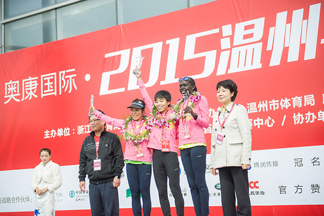 更大的惊喜随后到来,只见终点附近的工作人员和围观市民沸腾了,大家纷纷鼓掌欢呼。原来,女子组全马选手第一个抵达终点的,这次不再是非洲人,而是中国人,而且是本土作战的温州人——来自苍南的25岁女孩陈林明,她领先第二名的肯尼亚选手JANE JESANG 11秒夺得冠军,硬生生从“非洲军团”手中抢回一个冠军。而且,与陈林明同时站上领奖台的,除了黑人选手,还有一位也是温州人,乐清42岁的王小红获得季军。